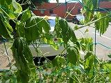 葉をうなだれたゴーヤ、午後1時過ぎのライブリー農園の状況です。朝はゴーヤも元気なのですが、強い日差しを浴び続け、こんな状態になってしまいます。沖縄出身のゴーヤ君もこの暑さにはびっくりのことだろうと思います。