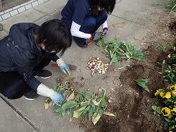第2回農園活動 投稿日時 : 2021/05/13 もおかライブリー教室 今日の農園活動は「チューリップの球根掘り」です。パンジーの間にある葉が枯れ始めたチューリップの球根を注意深く掘り出しました。茎から先を切り離して、水洗いをし、よく乾燥するように新聞紙の上に広げました。後日、ネットに入れて秋の植え付けまで保存する予定です。