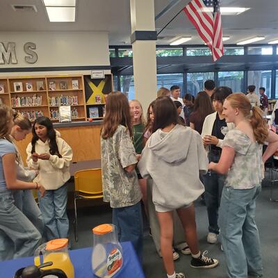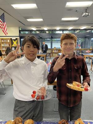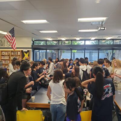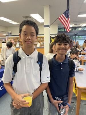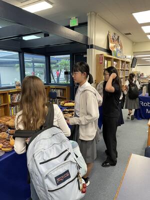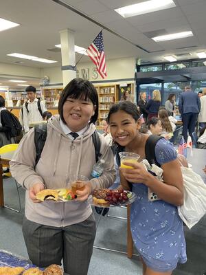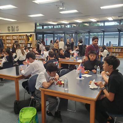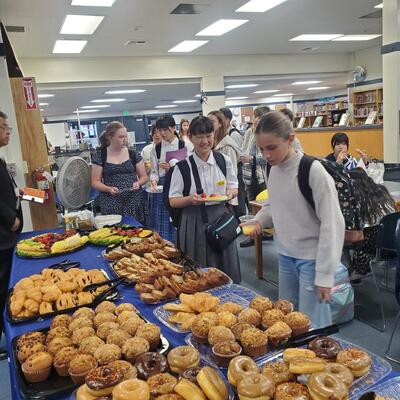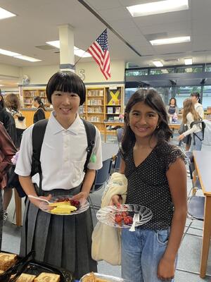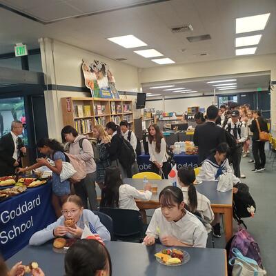 ぞくぞくと登校しています。図書室で朝食を食べています。