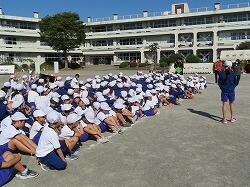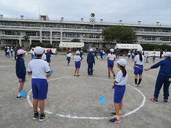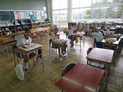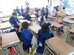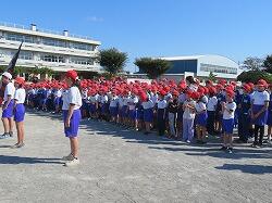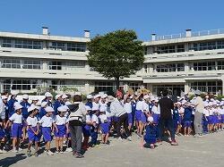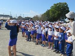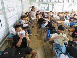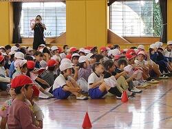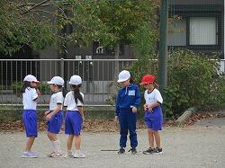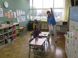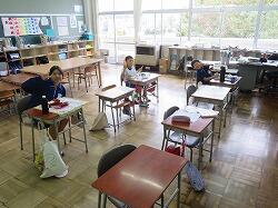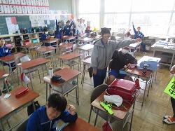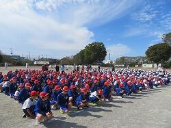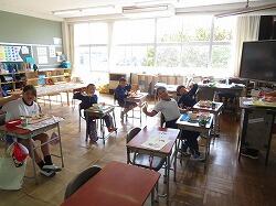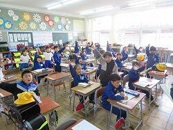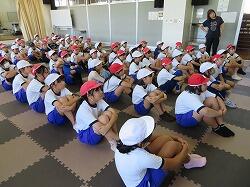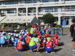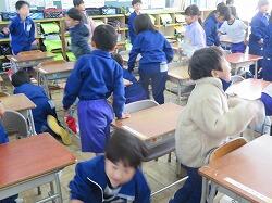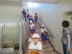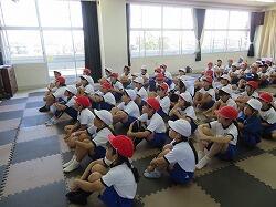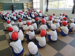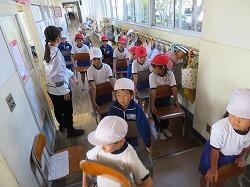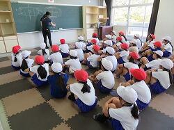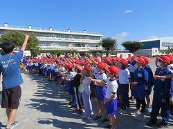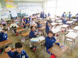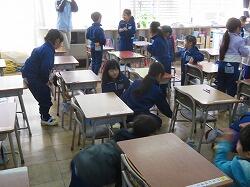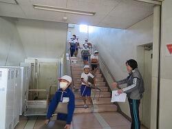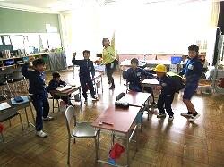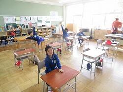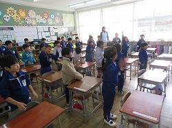 業間は、児童の安全を確保するために、椅子を持って外に出る練習をしました。