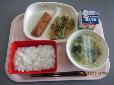 今日の給食は「春巻き」「春雨サラダ」「卵とわかめのスープ」でした。