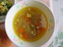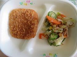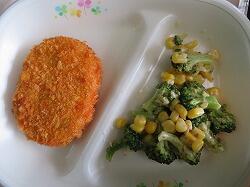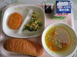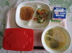 今日の給食は「野菜コロッケ・ソース」「ブロッコリーサラダ」「マリガトーニスープ」でした。