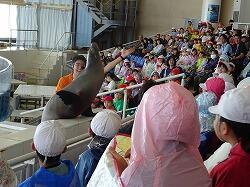 イルカのショーでは、飛んでくる水しぶきをレジャーシートなどで防いでいますね。楽しいショーだったかな。