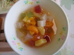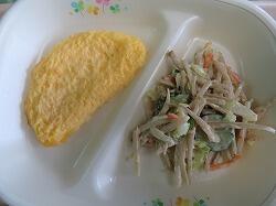 今日の給食は「オムレツ」「ごぼうサラダ」「フルーツポンチ」でした。