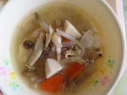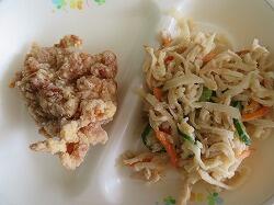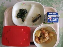今日の給食は「鶏のから揚げ切干大根のごま酢あえ」「いものこ汁」でした。