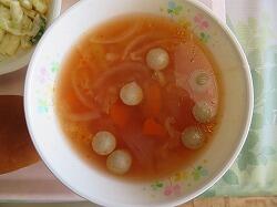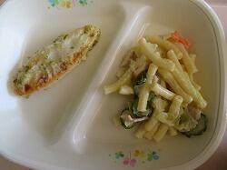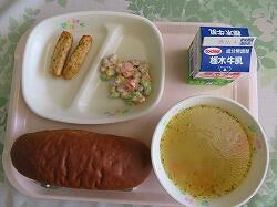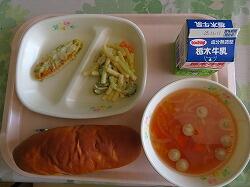 今日の給食は「笹かま磯部マヨ焼き」「マカロニサラダ」「ポトフ風トマトスープ」でした。