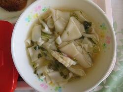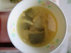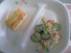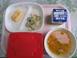 今日の給食は「厚焼き玉子」「かんぴょうサラダ」「カボチャ入り味噌汁」でした。