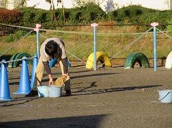 職員で校庭の水取り奮闘中