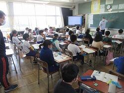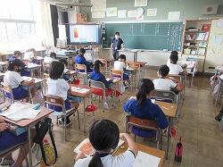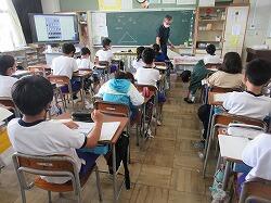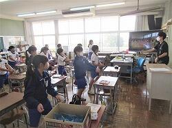そして、今日は、2年1組が1年1組に、2年2組が1年2組にオンラインで発表しました。実際に手に取って触れる体験はできませんが、1年生の目は、電子黒板の画面に釘付けでした。クイズも盛り上がっていました。