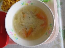 今日の給食は、「チキンカツレツ」「イタリアンサラダ」「肉団子と小松菜のスープ」でした。