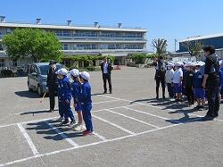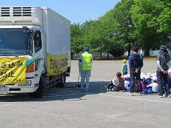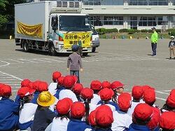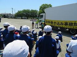 トラック協会、警察、交通指導員、市役所の方々に来ていただき、交通安全教室を実施しました。