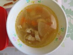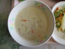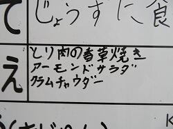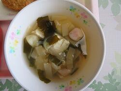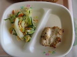 今日の給食は「とり肉の香草焼き」「アーモンドサラダ」「クラムチャウダー」です。
