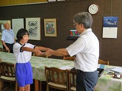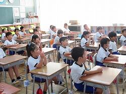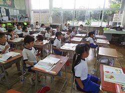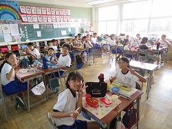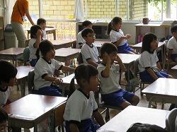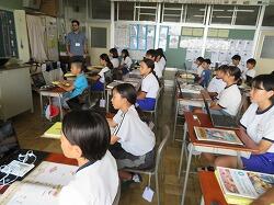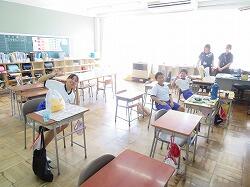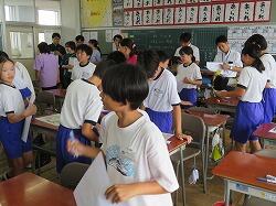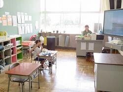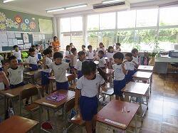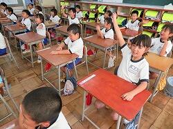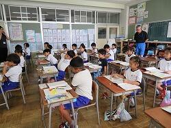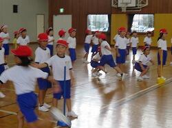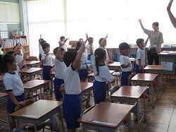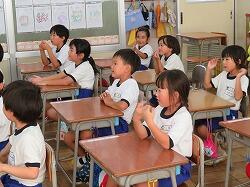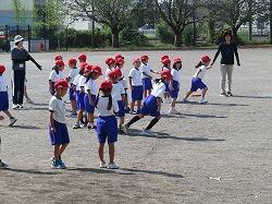 そうすると子供たちから大きな声で「こんにちは」とあいさつをしてくれました。どの子もニコニコとしており、元気そうです。「校長先生もやってください」と誘われてやってみるとなかなか難しく大変でした。