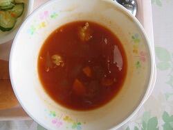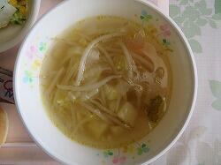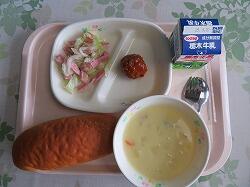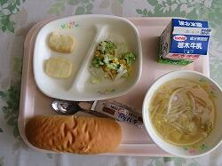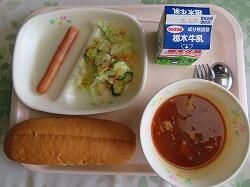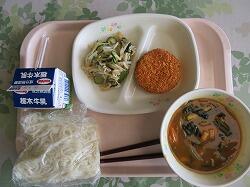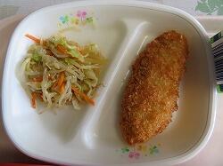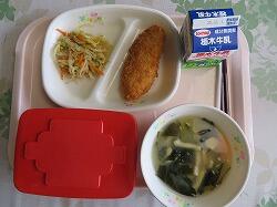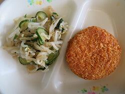 今日の給食は「焼きメンチカツ」「もやしときゅうりの和え物」「カレー汁」でした。