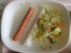 今日の給食は「フランクフルト」「アーモンドサラダ」「ポークビーンズ」でした。