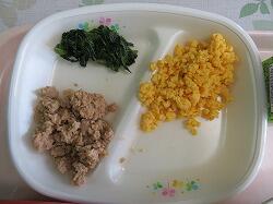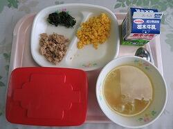 今日の給食は「鶏そぼろ」「卵そぼろ」「ほうれん草」「根菜のごま汁」でした。