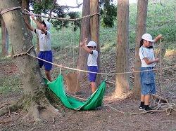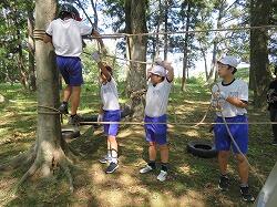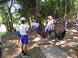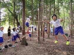 木と木の間に張ったひもの上を歩いたり、タイヤを渡ったり、楽しく遊ぶことができました。