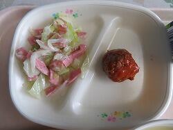 今日の給食は「肉団子」「ハムとキャベツのマリネ」「野菜シチュー」でした。