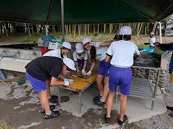 自然教室で、6年生はマスつかみ、マス焼きに挑戦しました。