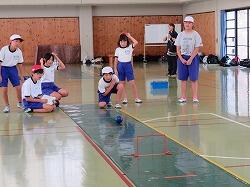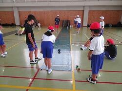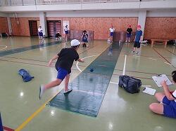 子供たちが取り組んでいたのは、ニュースポーツで「モルック」と「スマイルボウリング」でした。なかなか難しく、子供たちも楽しそうに活動していました。