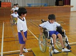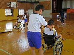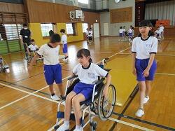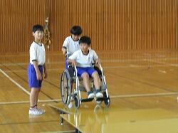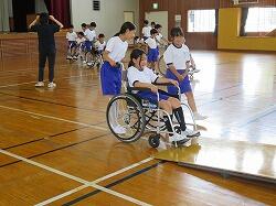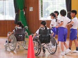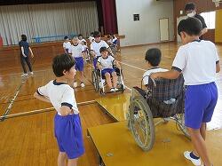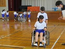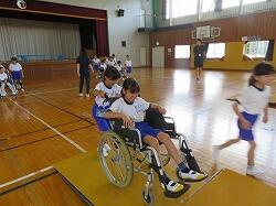 今日は、車いす体験をしました。車いすで乗る側と押す側のどちらも体験することで、子供たちなりに考えることがあります。押す側で段差があるところにおいて、「今から少し前を持ち上げますね」と声を掛けたり、坂道を降りるときに「ゆっくりおりますね」など、その時に応じた言葉かけを考えるようになります。