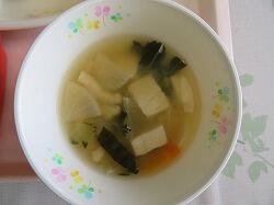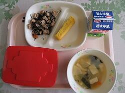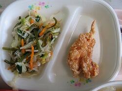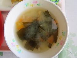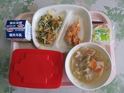 今日の給食は「鶏のから揚げ」「茎わかめのナムル」「豚汁」「洋梨タルト」「わかめごはん」でした。