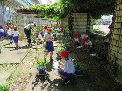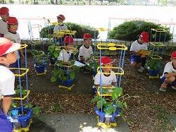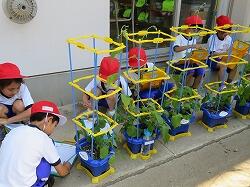 生活科でアサガオの観察をしたり、追肥をしたりしていました。ここのところの暑さのためか、支柱をたてたためか、急に大きくなったアサガオを見て「おっきい~。」と声をあげている子が、たくさんいました。