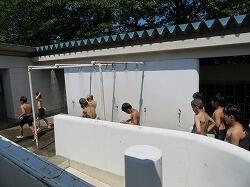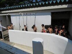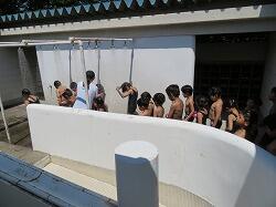 水泳の学習をしていました。シャワーを浴びたら、「つめた~い。」と喜んでいました。暑い日には、気持ちいいですよね。1年生は水慣れ運動を行い、4年生はクロールの練習を行っていました。