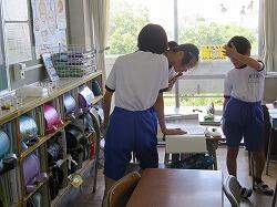 暑かったので、アサガオを日陰に移動して観察していました。自分のだけでなく、友達のも観察する一年生がいました。