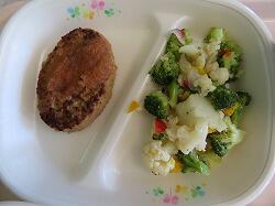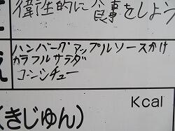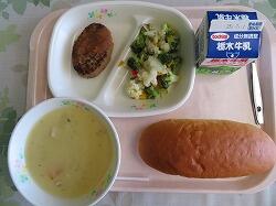 今日の給食は「ハンバーグアップルソースがけ」「カラフルサラダ」「コーンシチュー」でした。