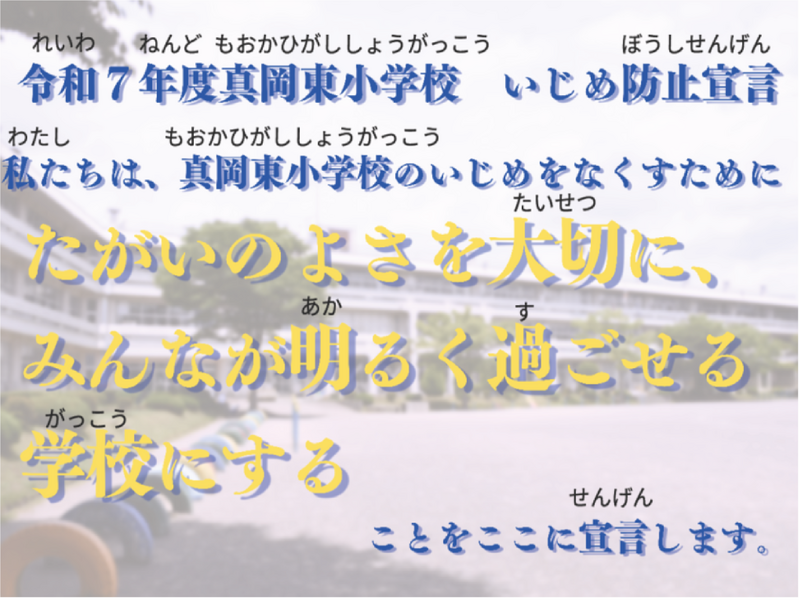 今年度のいじめ防止宣言は「たがいのよさを大切に、みんなが明るく過ごせる学校にする。」に決まりました。東っ子みんなで、明るく過ごせる学校にしていきましょう。
