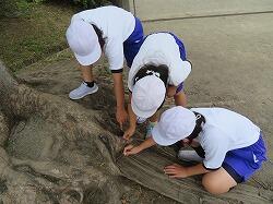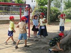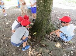 1年生の遊んでいるところに行くと、「先生これ見て、クワガタの頭。」と見せてくれる子や、「先生、歯が抜けたの。写真撮って。」という子、「今、何していると思う?」と質問をしてくるので見に行くとアリの巣の観察をしている子、「何を持っていると思う。」と聞いてくるので、「何だろうね。」を返したら、手の中には何匹もダンゴムシがいました。