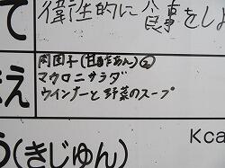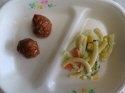 今日の給食は「肉団子」「マカロニサラダ」「ウインナーと野菜のスープ」でした。