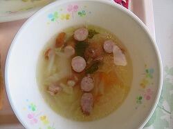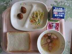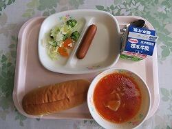 今日の給食は「フランクフルト」「チーズサラダ」「ミネストローネ」でした。