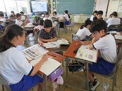 2年1組では、生活科で「生き物のことを調べる」学習をしていました。グループで飼いたい生き物について、一人一台端末や図鑑などを利用しながら、生き物のことを調べていました。