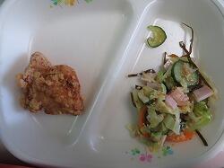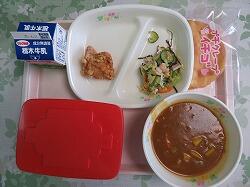 今日の給食は「とりのから揚げ」「りっちゃんの元気サラダ」「野菜たっぷりカレー」「いちごクレープ」でした。