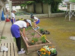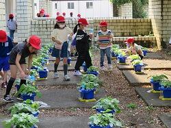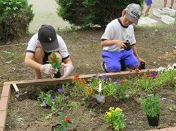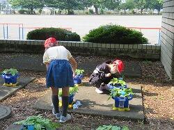 どこにどの色の花を植えたらよいか話し合って植える姿がありました。