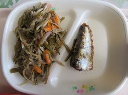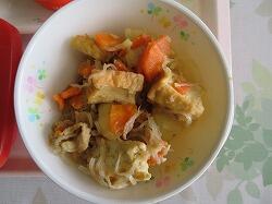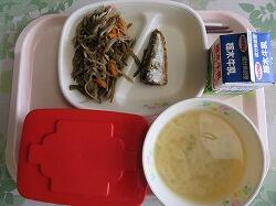 今日の給食は「いわしのみぞれ煮」「五目きんぴら」「豆乳仕立ての野菜汁」でした。
