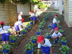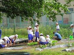 登校してくると農園に水やりに行く東っ子たちがいました。