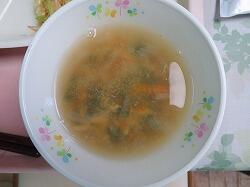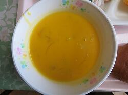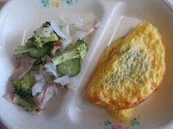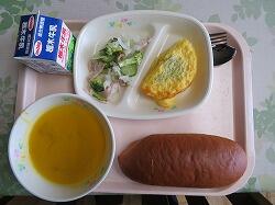 今日の給食は「ほうれん草オムレツ」「ハムと野菜のサラダ」「かぼちゃのポタージュ」でした。