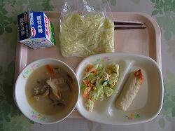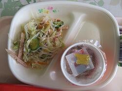 今日の給食は「すり身チーズロール」「チキンサラダ」「ちゃんぽん麺」でした。