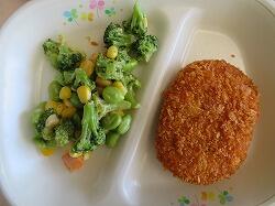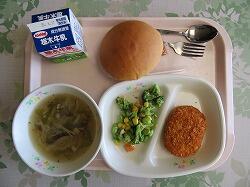 今日の給食は「牛肉コロッケ」「枝豆のサラダ」「きのことベーコンのスープ」でした。