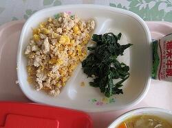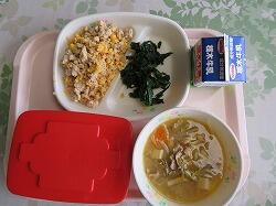 今日の給食は「とりそぼろ、卵そぼろ、ほうれん草」(3色ごはん)「県産みそしる」でした。