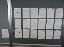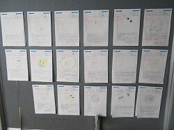 5年生の廊下の掲示物に、理科の学習で観察したメダカの卵の成長の様子が記録されていました。