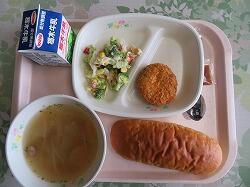 今日の給食は「メンチカツ」「シーザーサラダ」「県産野菜のコンソメスープ」でした。