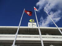 青空と白い雲を背景に真岡東小の金色の校章が輝いています。