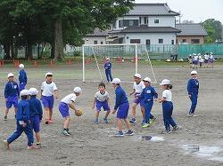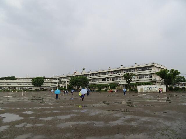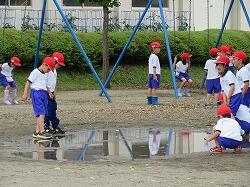 水たまりが残る校庭で、東っ子たちが元気に外遊びを楽しんでいました。