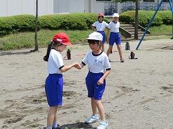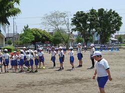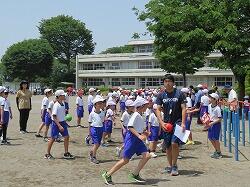 今日は、初めての顔合わせを行い、自己紹介などをしました。その後、校庭で班ごとに考えたふれあい遊びを行いました。