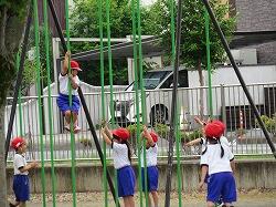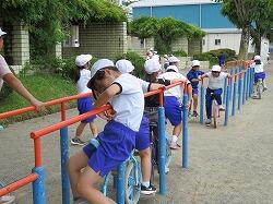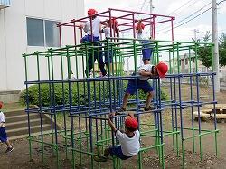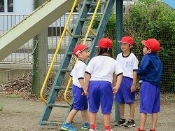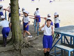 朝の雨でできた水たまりで遊ぶ子供たちがいました。登り棒を上手に登ることができる1年生がいました。
