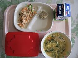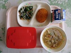 今日の給食は「野菜コロッケ」「磯辺あえ」「こしね汁」でした。